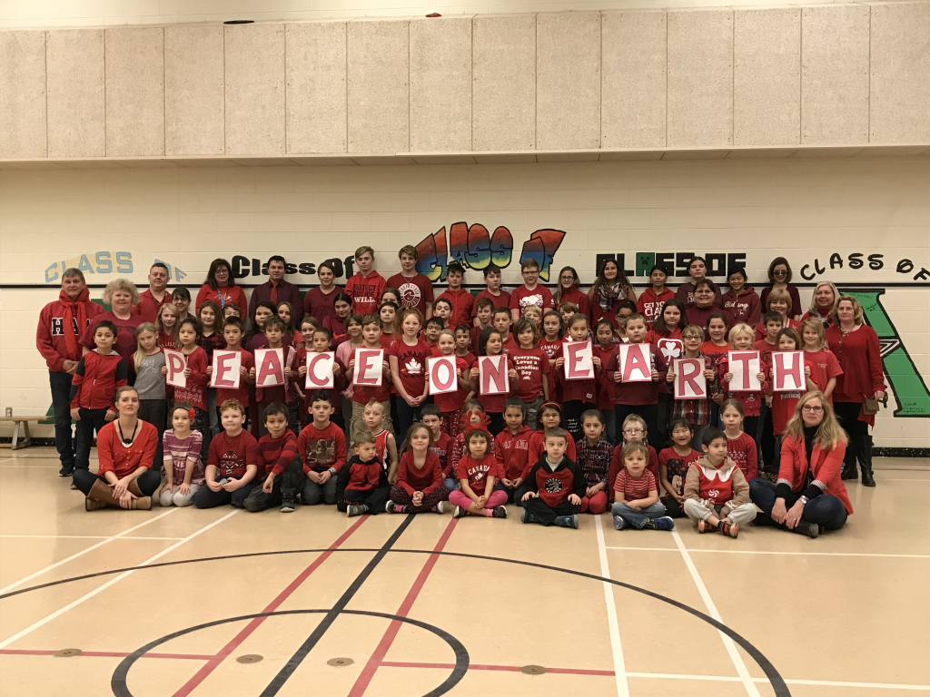 The students and staff of Assiginack Public School in Manitowaning, ON showing their support for Canadian Armed Forces Members on Friday, Dec. 8, 2017. Members of the Grade 2/3 class are holding letters to spell out Peace on Earth, in recognition that so many of our service men and women are serving away from their families this holiday season, and if there were Peace on Earth, they could be home!