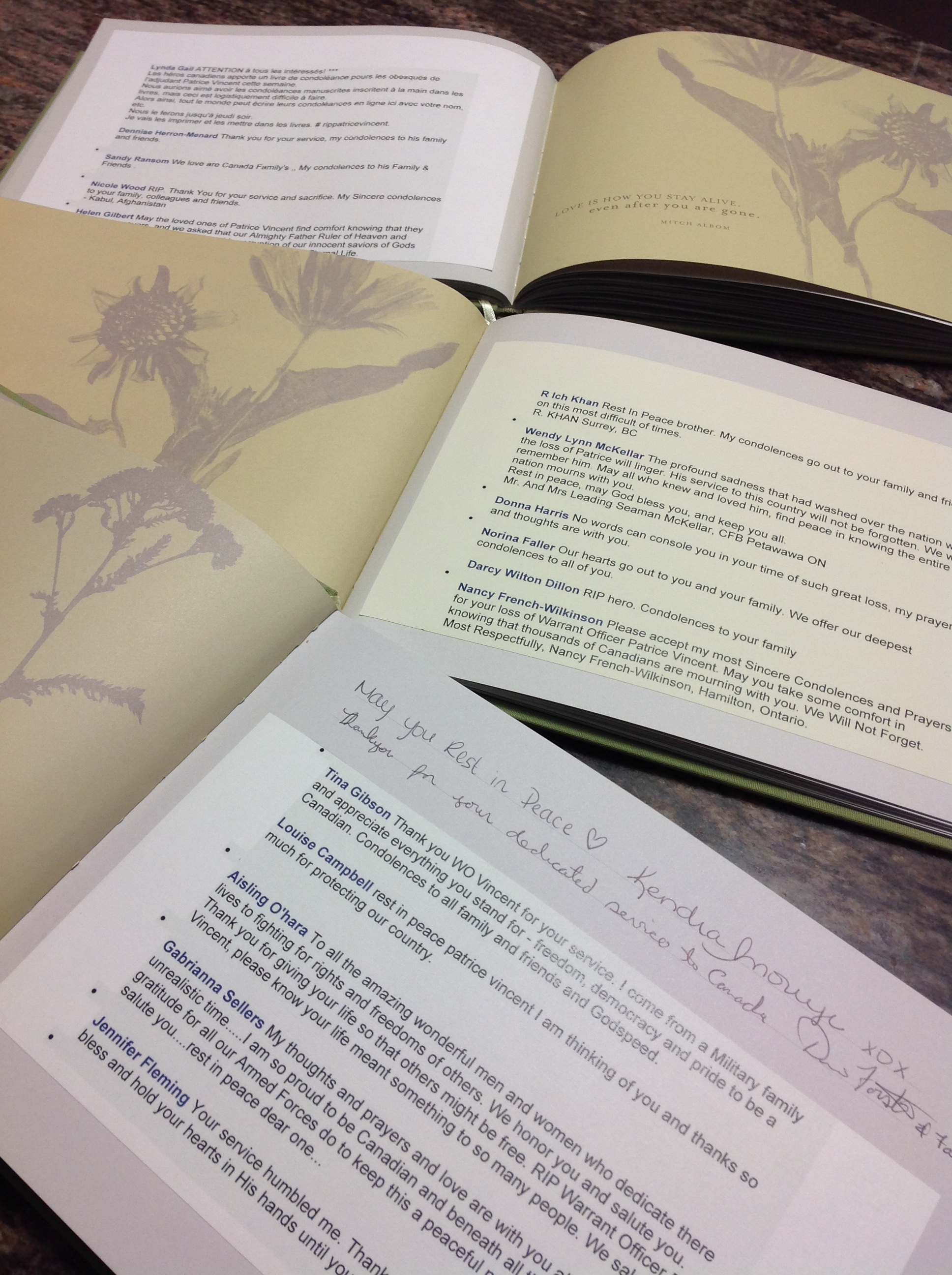 Here are some pictures of our books of condolence for the Vincent family, one shows the people at the First Ontario Centre signing them after the ceremony, and the books are a combination of signatures and also ones we printed off and put into the books on paper. We think we are over 700 at the moment. There are some great writings that people from all over the world have expressed here, true love, emotion, support and condolence for the families loss.