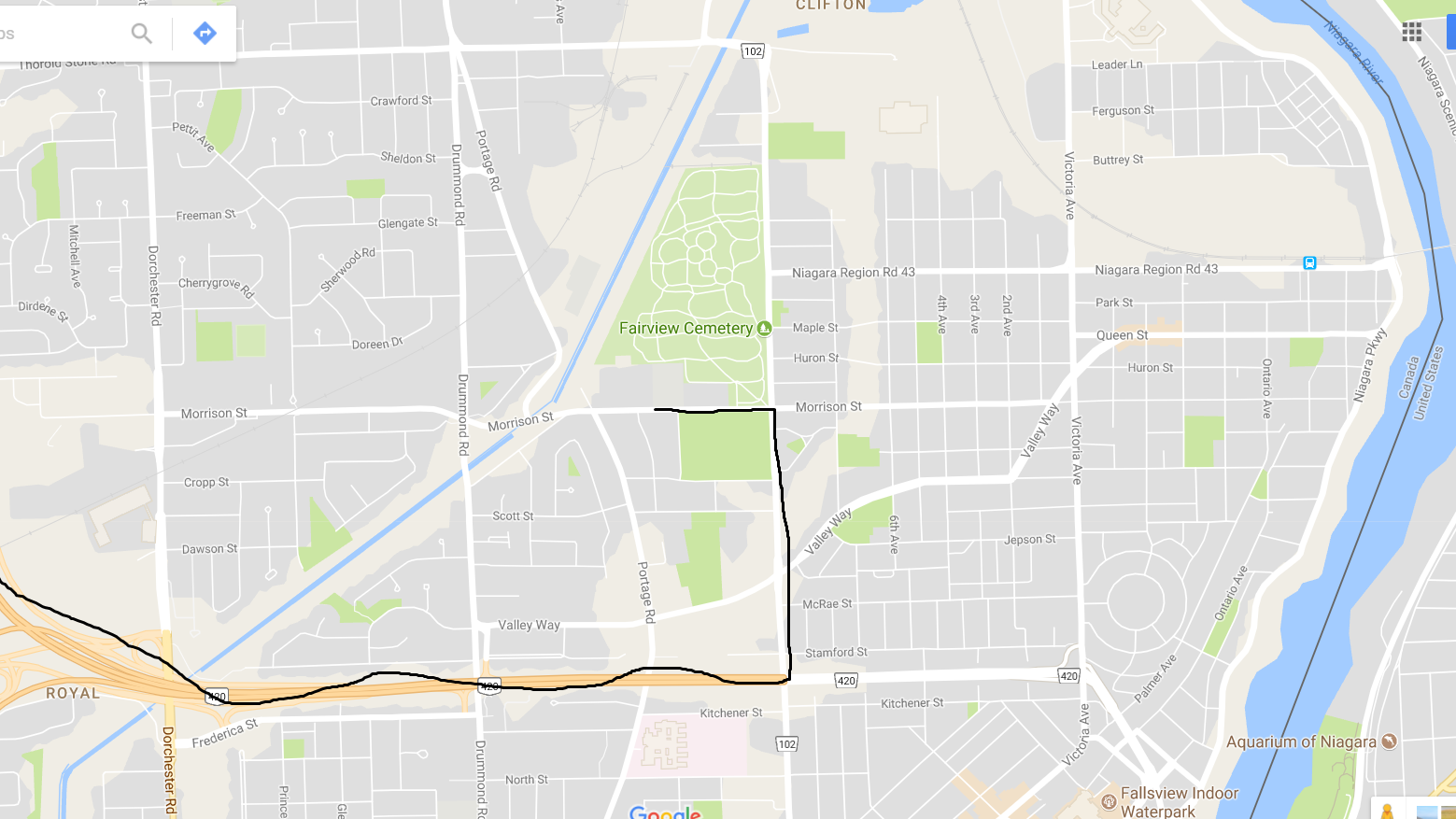 Route will be via the 401, 403, QEW, 420 to St. Andrews United Church in Niagara Falls at 5645 Morrison Street.