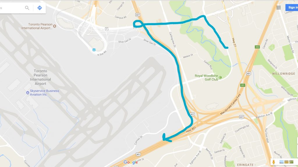 Here is a picture of the route from the start in Toronto to the 401 westbound.